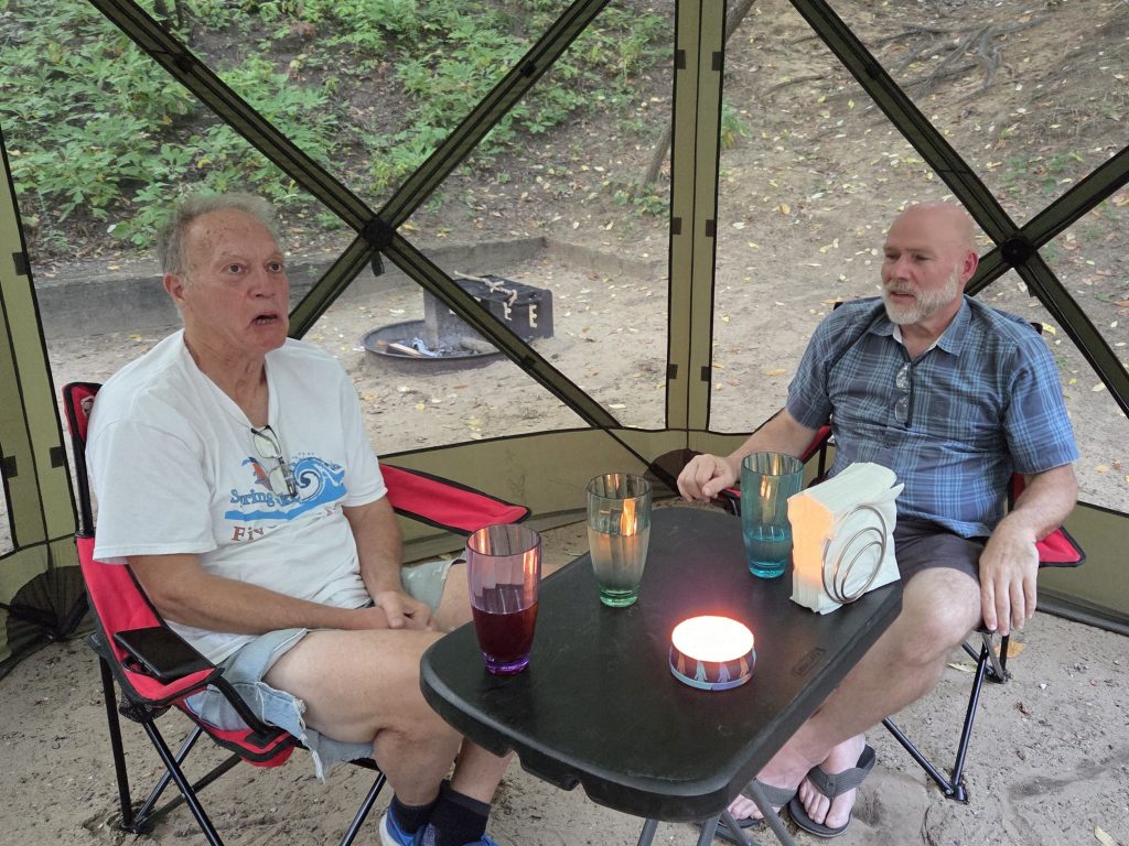 Where we spent one day back in Illinois (Chicago), one day in Michigan (with “Gail’s Charlie”, Charlie-W, her baby brother, who lives ~30 minutes up the eastern shore of Lake Michigan), and one day hanging out/visiting around Beverly Shores, Indiana, where we were camped at Dunewood Campground. This is the 1st National Park Campground to which we’ve made a repeat visit. And Charlie visited us here again, upon our arrival. We actually pitched our screen tent, for hors d’oeuvres outside, protected from those Indiana bugs.