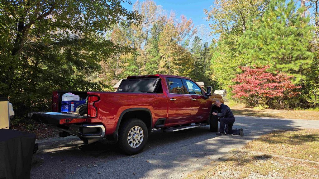 Over a 4-night stay, we mostly just hung out in the park (southwest of Richmond), enjoying the beautiful weather and the change of the seasons, doing a little hiking (saw a beaver!), and leisurely doing some chores. Unfortunately, while greasing The Brute, Mark discovered an oil leak. So, he spent a morning at a nearby Chevrolet dealer getting that rectified. We did have dinner with RSE friends John-G and Ann, northwest of Richmond last night. These are the friends who recommended John Hall Alaska Tours to us. Now we have recommendations for touring Italy!
