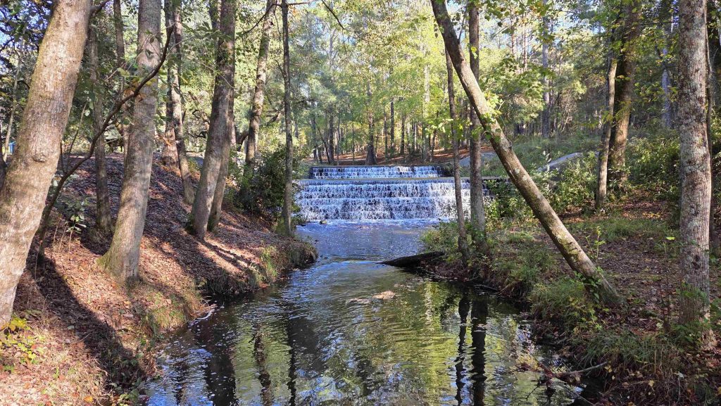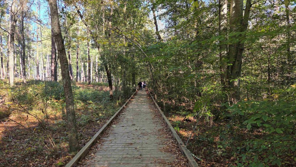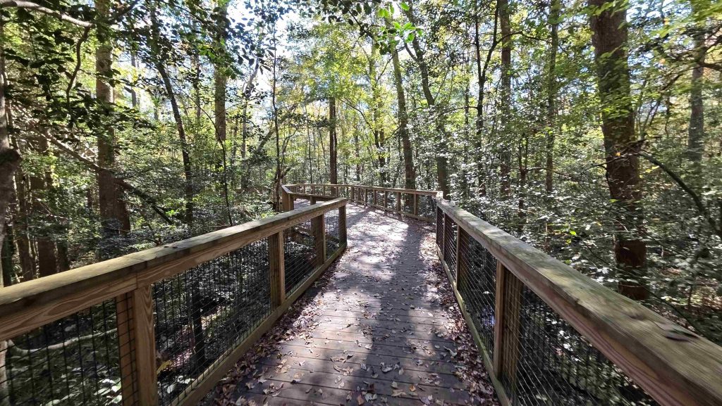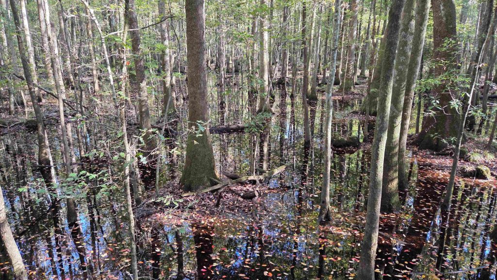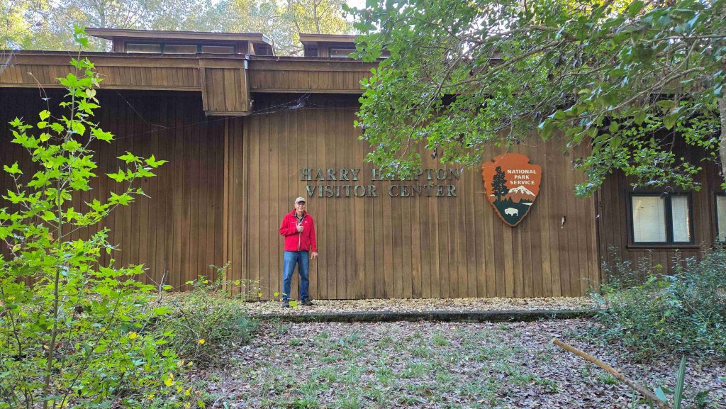 - Congaree National Park (#310), first time we’ve visited a National Park Site during a government shutdown. (The Visitor Center was closed, so no stamp and no new brochure.) Congaree National Park has the largest intact expanse of old growth bottomland hardwood forest remaining in the southeastern United States. Waters from the Congaree and Wateree Rivers sweep through the floodplain. We hiked around the Visitor Center for a couple of hours and heard a LOT of birds!