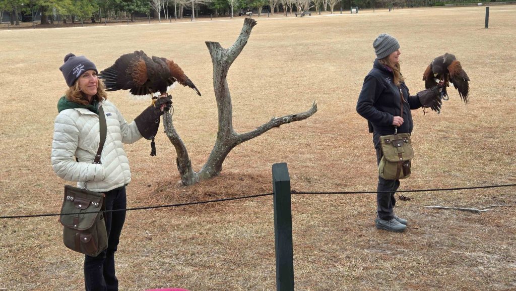 We joined friends Steve & Jane for dinner Thursday evening, visited the Sewee Visitor & Environmental Education Center on Friday, and visited the The Avian Conservation Center & Center for Birds of Prey yesterday. We saw our first alligator of 2026, 3 Red Wolves, and a wide variety of birds of prey from around the world, some only in cages, several in Flight Demonstrations.