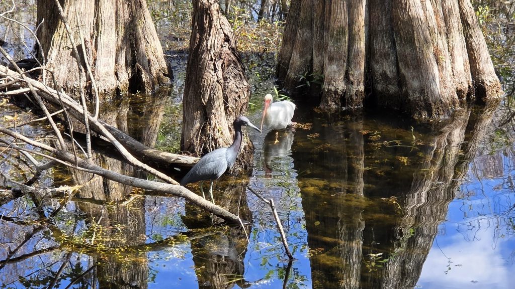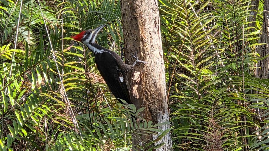 It is now warm enough for shorts, on the west coast of Florida. Our short stop started with a visit to Six Mile Cypress Slough Preserve, where we walked the 1.2 mile boardwalk and saw an alligator, several turtles, and lots of birds. We must have spent 20+ minutes watching a pileated woodpecker munching on bugs in a dead tree, just 6-8 feet in front of us!
