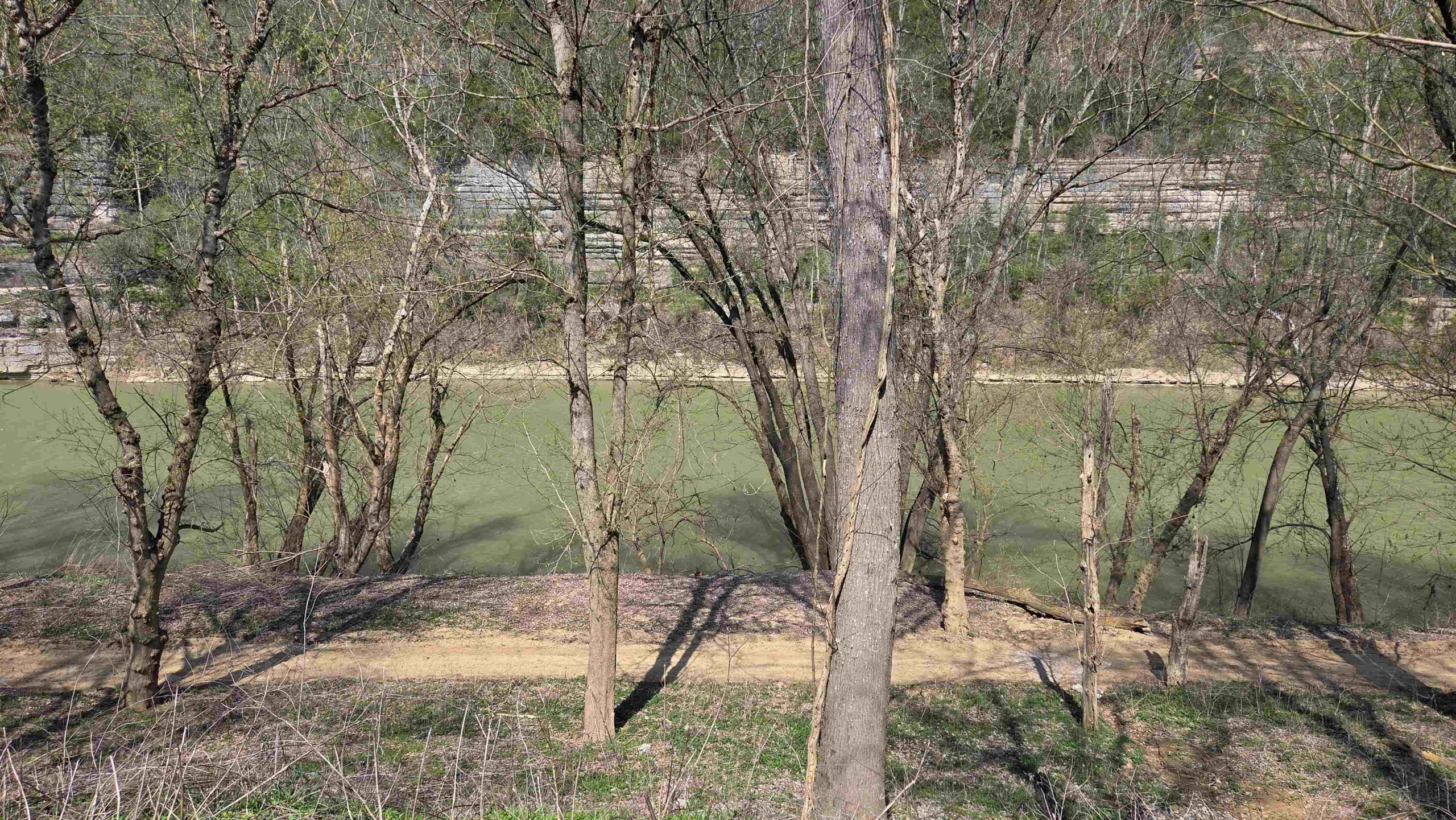 Camping at Cummins Ferry RV in Salvisa, KY (population 410…hence the “More Rural”…that, and all the farms we passed on the way!) It was a little hairy getting here, as the last mile was 1 lane, steep, and curvy. Once here, however, we got a spot backed up right on the Kentucky River, great place to “just hang out”. They also have trails which we checked out, down by the river and up the hill behind us.