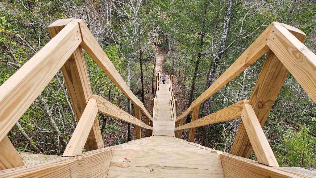 - Big South Fork National River & Recreation Area (#322), encompasses 125,000 acres of the Cumberland Plateau and protects the free-flowing Big South Fork of the Cumberland River and its tributaries. The area boasts miles of scenic gorges and sandstone bluffs, is rich with natural and historic features and has been developed to provide visitors with a wide range of outdoor recreational activities…like steep stairs on trails, to get up/down huge rocks and campgrounds with water and electric! We camped at Bandy Creek, 0.3 miles from the main Visitor Center, a bit to the southern part of the park.