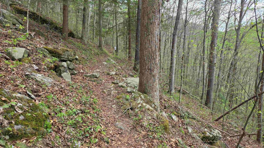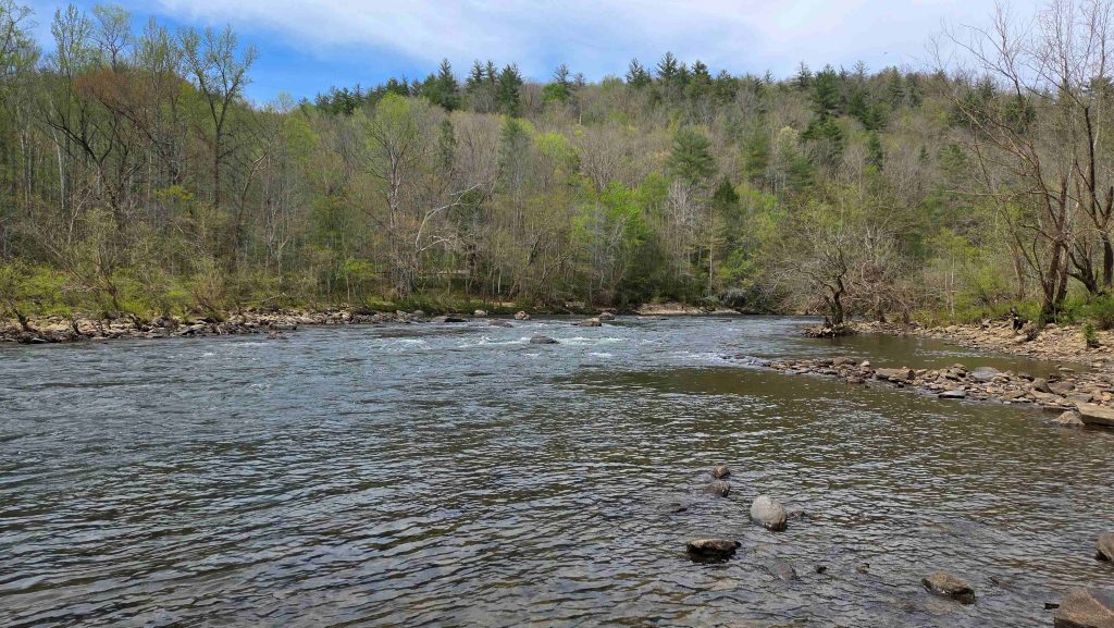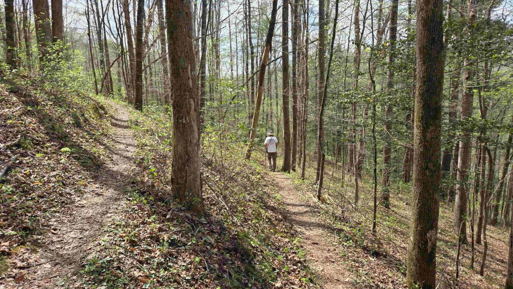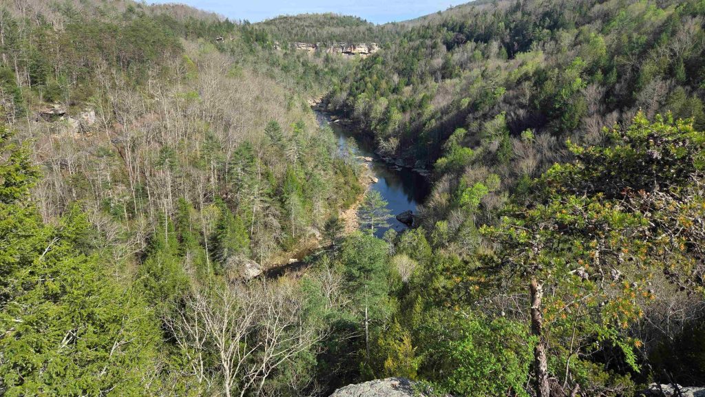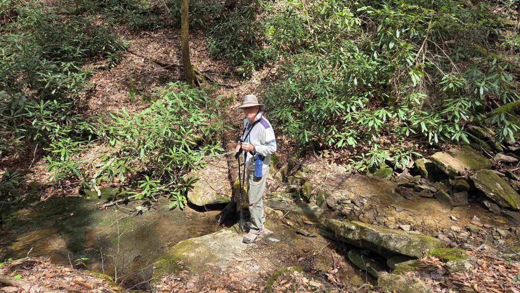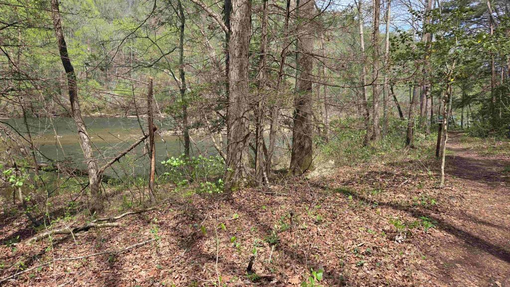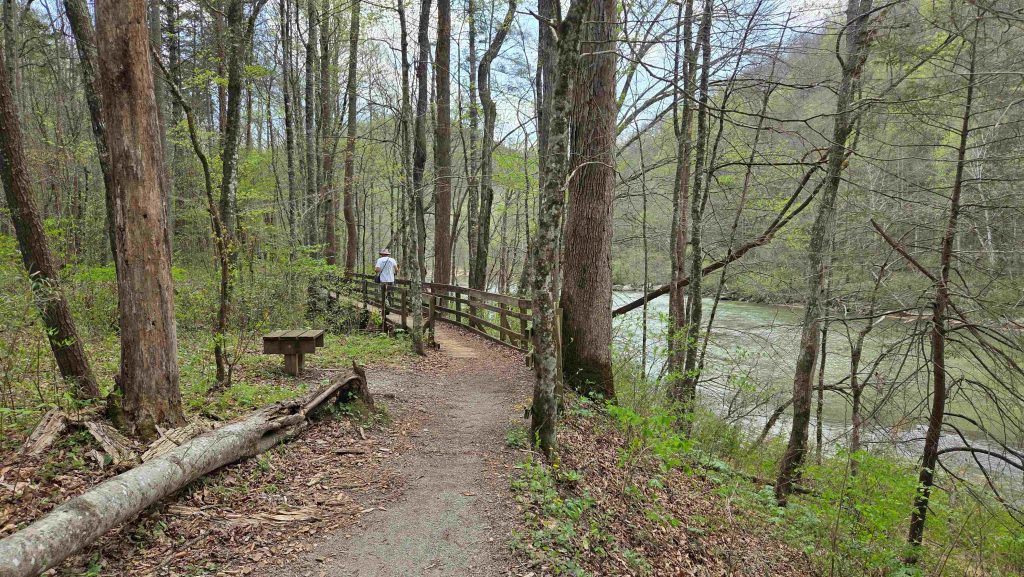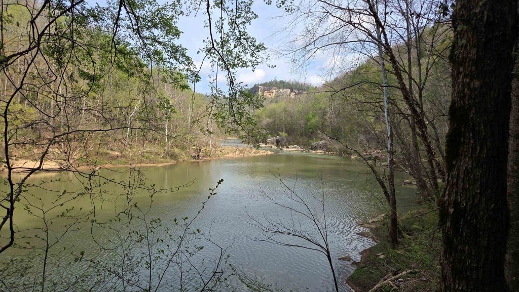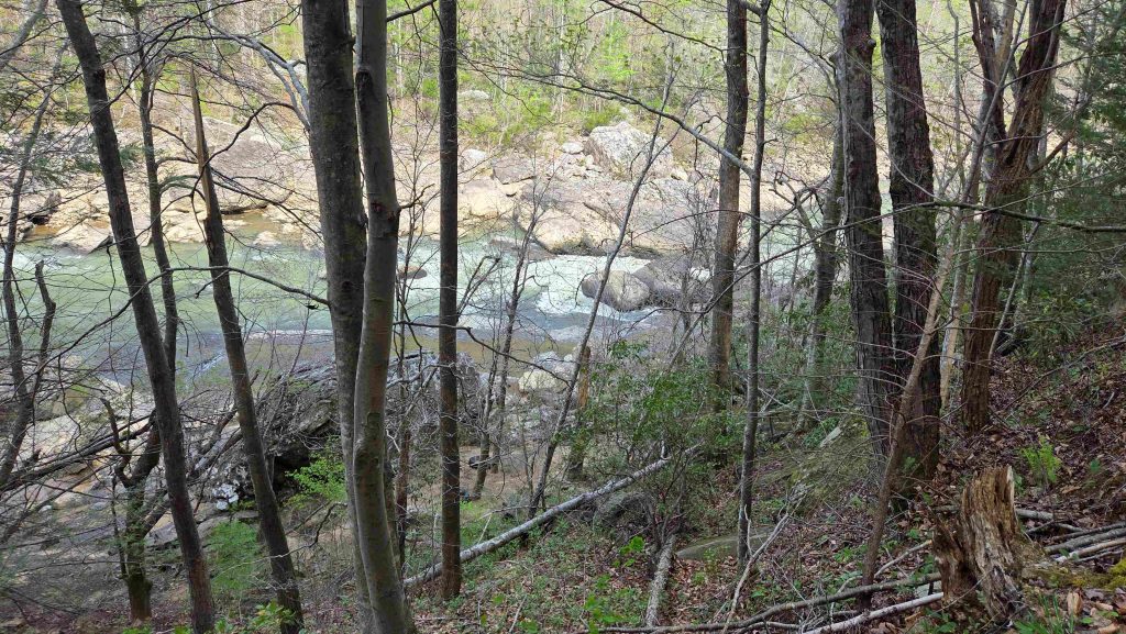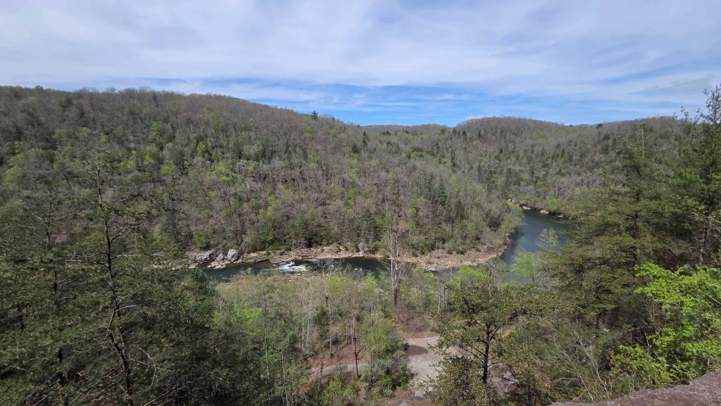 Saturday, a gorgeous day, we skipped going north to Kentucky, to do more hiking close by, near the Leatherwood Ford of the Big South Fork. We warmed up on the relatively flat 2-mile Angel Falls Rapid Trail, going down river to what was a 10-12 foot split current waterfall. It is now dangerous rapids, since some fishermen blasted a huge boulder in 1954. Then we drove on up to the East Rim, just above the Ford. There we first checked out the East Rim Overlook. It was also where we started the 3.3-mile Leatherwood Loop Trail, down one side of a ravine back to Leatherwood Ford, along the river a bit, and back up the other side of the revine. Back at Bandy Creek, we did the flat, 1.3 mile Bandy Creek Loop Trail as a “cool down”.