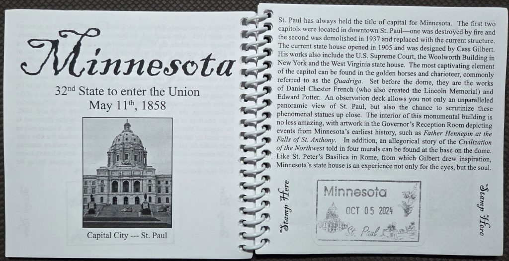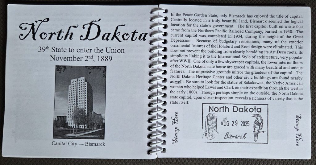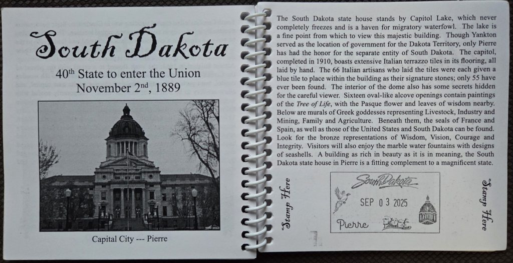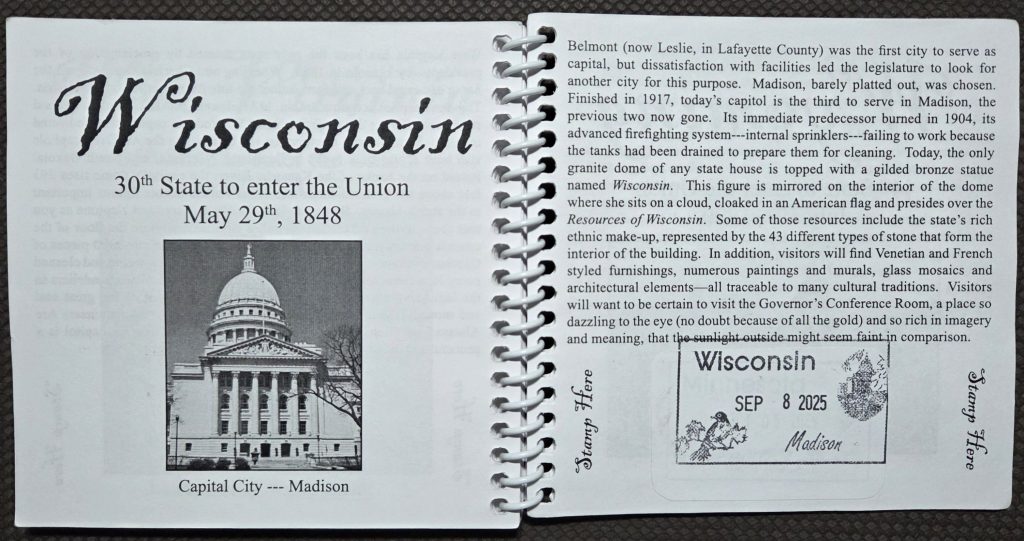 We have toured 43 State Capitols (as of September 8, 2025). Since our 4th Capitol visit (Des Moines, Iowa), we’ve been collecting stamps in the Capitol Collection Passport Book! (and we’ve made it back to the 1st & 3rd (Boston, Massachusetts & Providence, Rhode Island) for a stamp & revisit.)