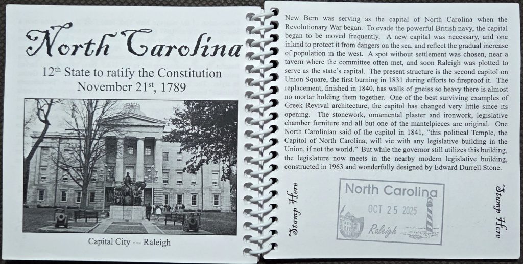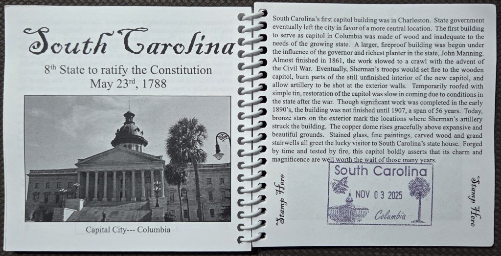 We have toured 45 State Capitols (as of November 3, 2025). Since our 4th Capitol visit (Des Moines, Iowa), we’ve been collecting stamps in the Capitol Collection Passport Book! (and we’ve made it back to the 1st & 3rd (Boston, Massachusetts & Providence, Rhode Island) for a stamp & revisit.)