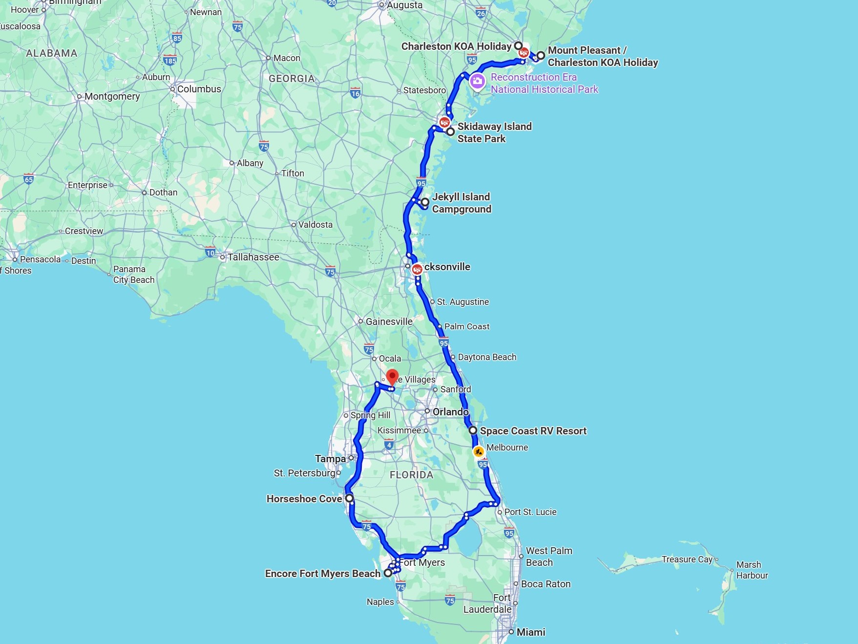 South on coast, Charleston SC to Titusville, Florida,